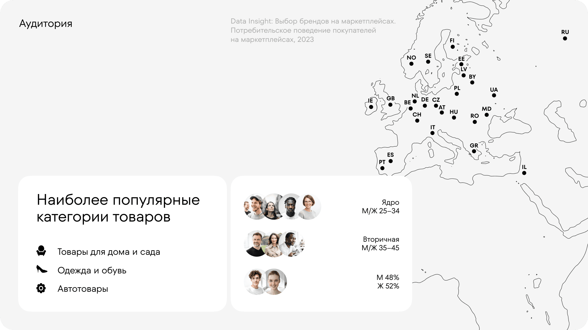 Целевая аудитория маркетплейсов в России слабо сегментирована по полу: 48% — мужчины и 52% — женщины. Ядро аудитории — люди в возрасте 25–44 года, платёжеспособные, со средним или ниже достатком.