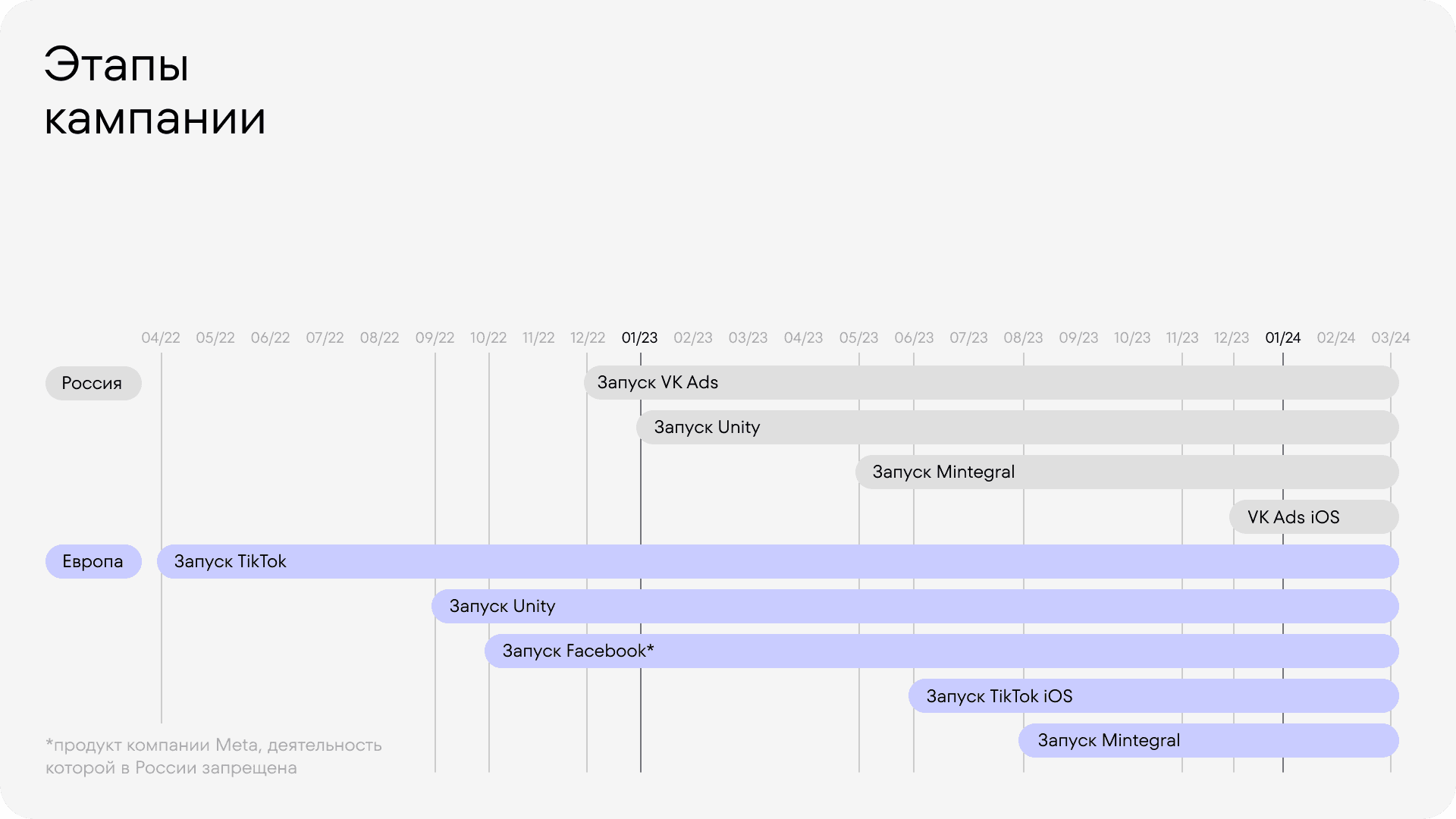 VK Ads, Unity, TikTok, Bigo, Meta*, Mintegral, Snapchat, «Яндекс Директ»
