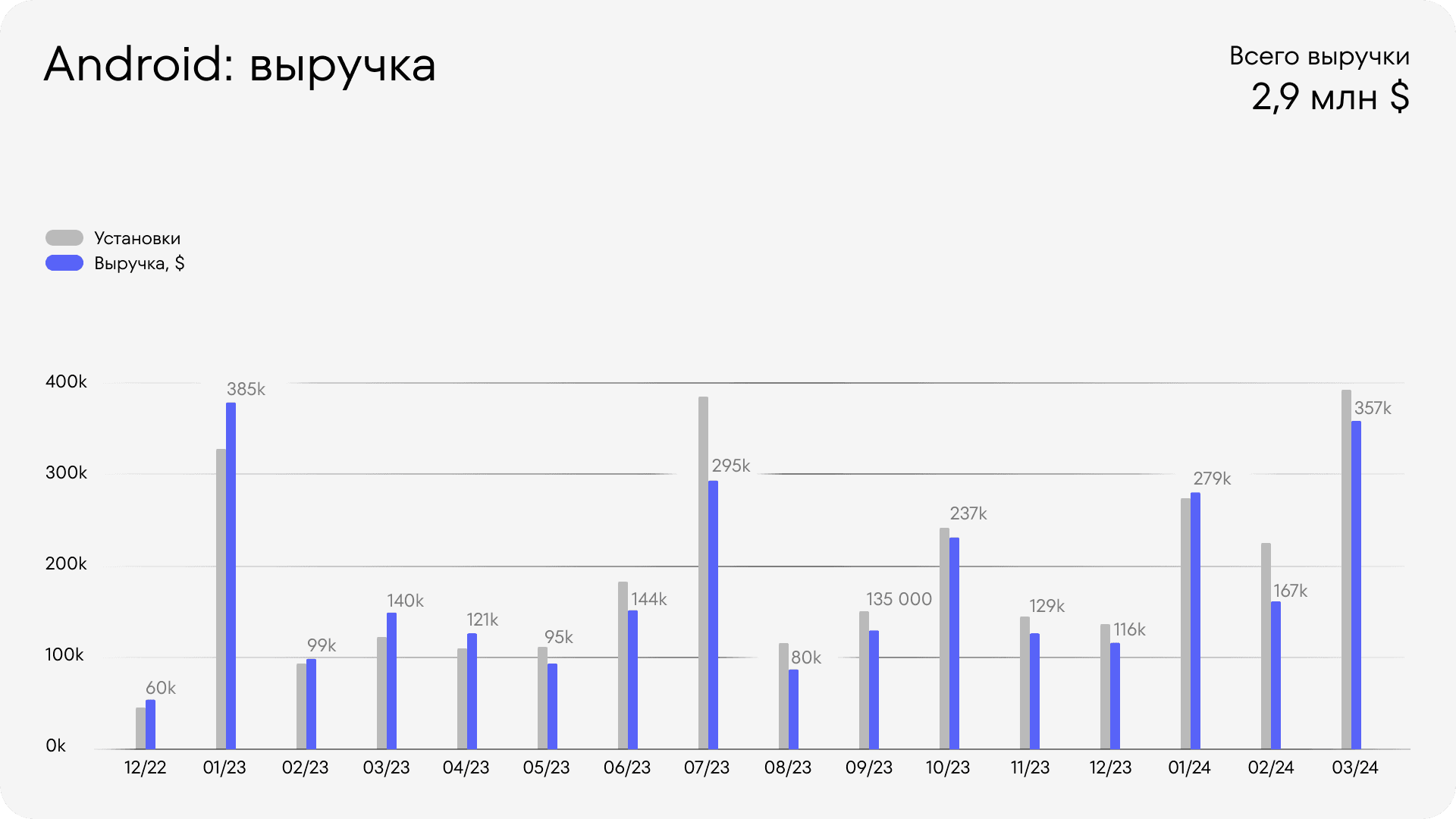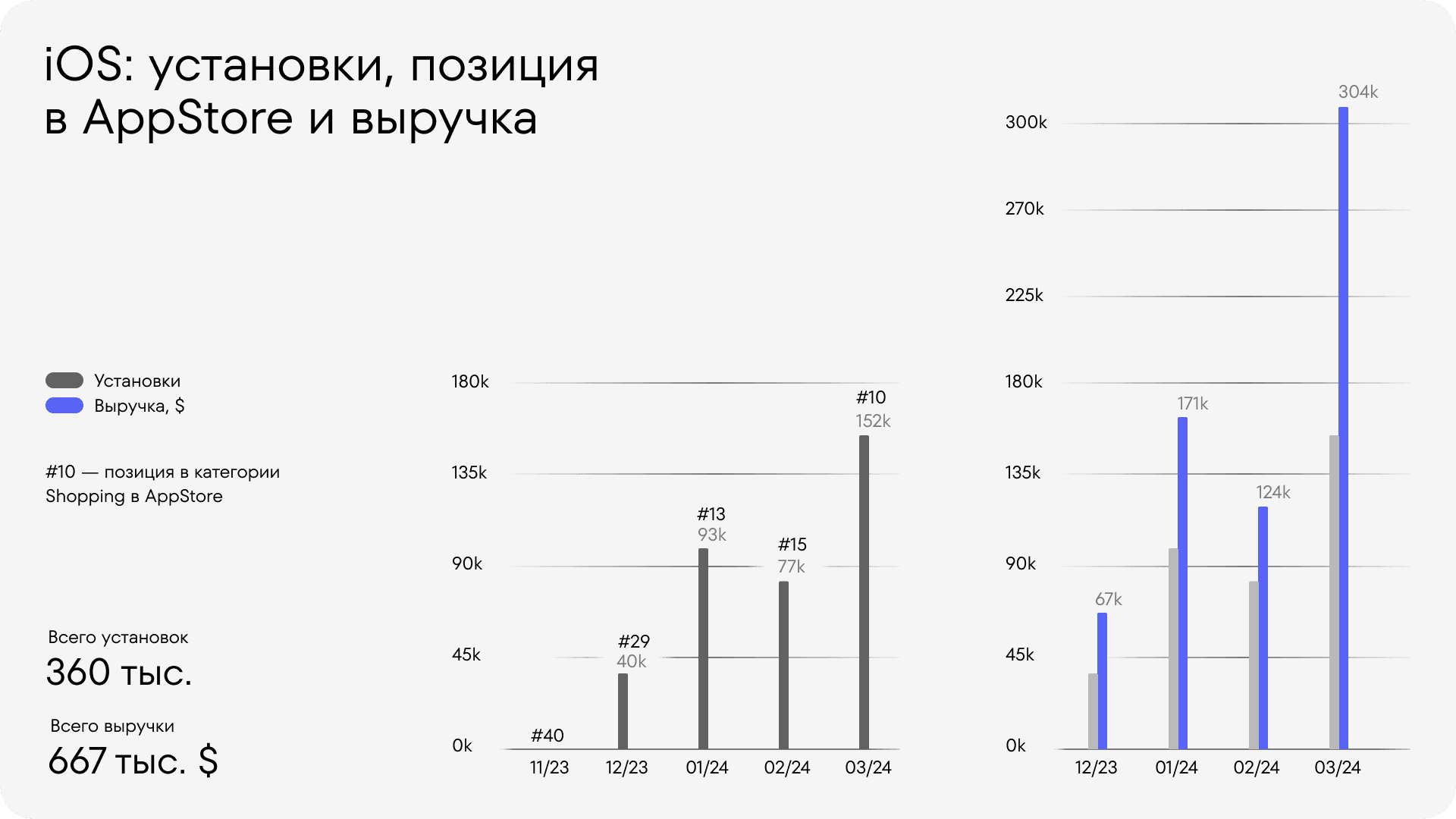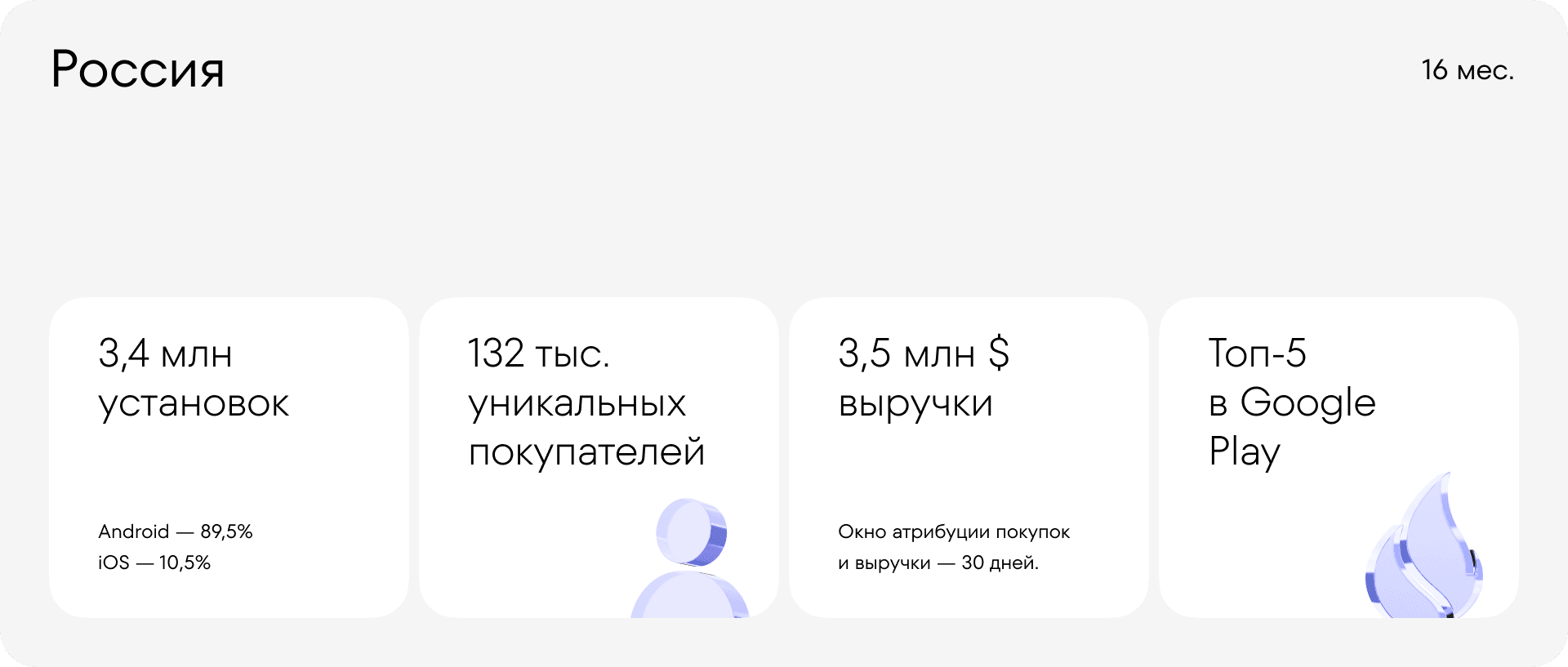 В декабре 2023 года мы запустили iOS-кампании в VK Ads. Средняя выручка на уникального пользователя продукции Apple за четыре месяца кампании оказалась на 70% больше, чем на аналогичного Android-юзера. Это позволило существенно увеличить выручку кампании в России и сделало iOS наиболее перспективной платформой для привлечения пользователей.