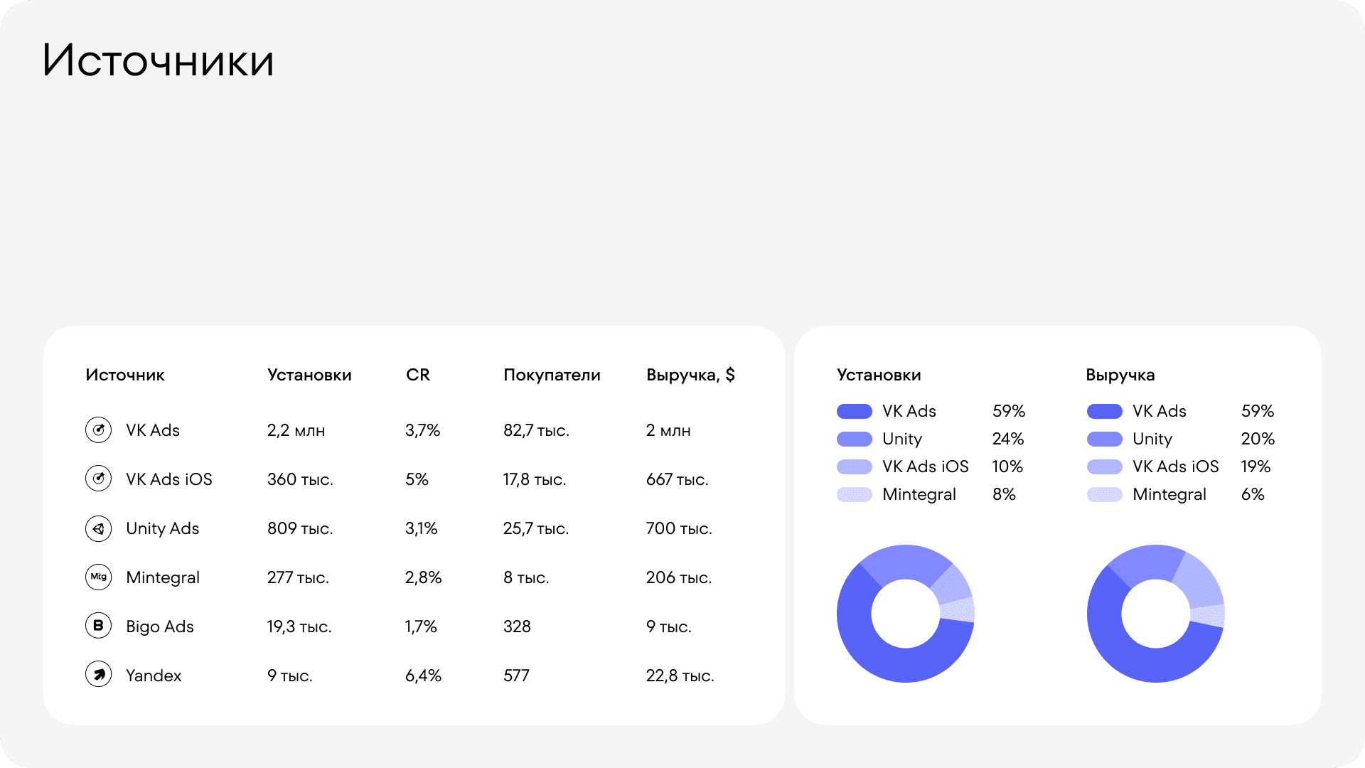 Открытием кампании стали Unity и Mintegral. Изначально менеджер Unity отговаривал нас от продвижения маркетплейса, утверждая, что источник предназначен для рекламы мобильных игр, а не e-commerce-продуктов. Однако в результате 24% от всех установок пришлось на Unity. Основной сложностью стал поиск платёжеспособной аудитории. Для этого мы вручную обрабатывали site id’s, ориентируясь на CR в покупку, средний чек и RR.