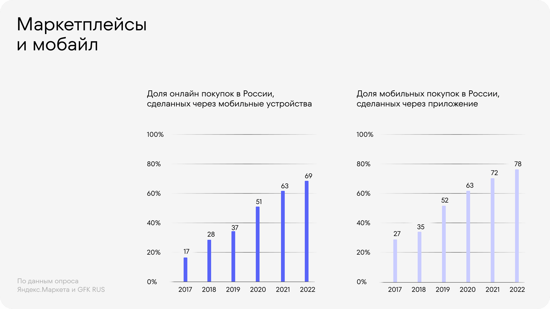 В 2022 году в России доля мобильных покупок в общем объёме продаж в e-com составила 69%. Ожидается, что к 2025 году этот показатель достигнет 73%.