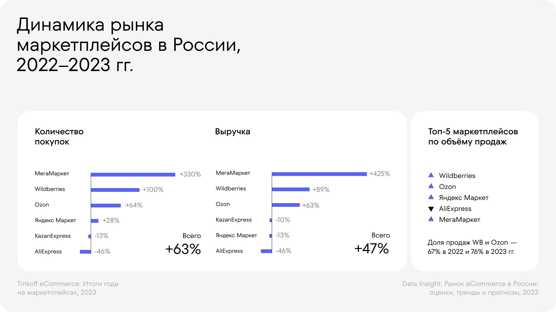 В 2023 году маркетплейсы стали драйвером российской онлайн-торговли — совокупный объём трат на них вырос почти в 1,5 раза год к году. Усилилась консолидация рынка — доля продаж на Ozon и WB составила более 75%. При этом большинство мультибрендовых интернет-магазинов, например ASOS, Farfetch и Shein, ушли с российского рынка годом ранее.